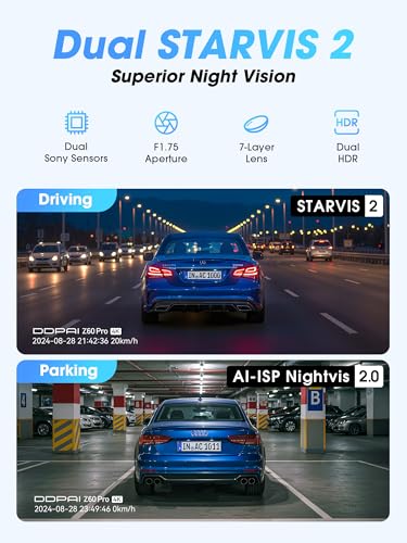 4K + 1080P Dual STARVIS 2 Sensors Dashcam: Equipped with powerful STARVIS 2 IMX678 (front) and IMX662 (rear) sensors, the premium DDPAI Z60 Pro dash cam captures every detail in stunning clarity, with 2160P@30fps front and 1080P@30fps resolution. It delivers ultra-clear, sharp video quality even in low-light conditions at night, with no glare from headlights and no grainy noise