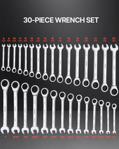 VEVOR Combination Wrench Set, 30-Piece Ratcheting Wrench Set with Organizer Rack, Cr-V Steel Wrench Set SAE 1/4″ to 1″, Metric 8 mm to 24 mm, Ideal for General Household, Garage, Workshop, Emergency