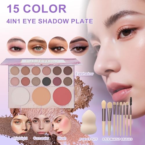 【All in One Makeup Kits】This Makeup Gift Set includes everything you need for a full-face look: facial cleansing brush, foundation, setting spray, loose powder, eyebrow pencil, mascara, eyeliner, concealer, lip liner, lip gloss, Makeup base, makeup palette, powder puff, cosmetic brush. One set can solve all your facial makeup