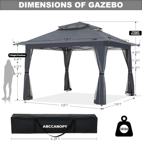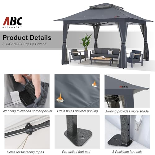 ABCCANOPY 13×13 Pop Up Gazebo, Outdoor Canopy Tent, Instant Screened Shelter with Mosquito Netting for Patio, Garden, Backyard, Party, Camping (Dark Gray)