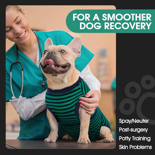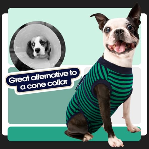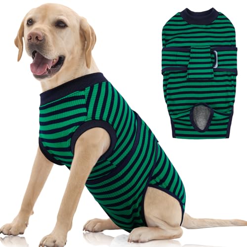 FUAMEY Recovery Suit for Dogs After Surgery,Soft Breathable Dog Bodysuit E-Collar & Cone Alternative Surgical Suit,Male Female Dog Neuter Spay Suits Anti Licking Wounds Onesie Green Black Stripes L